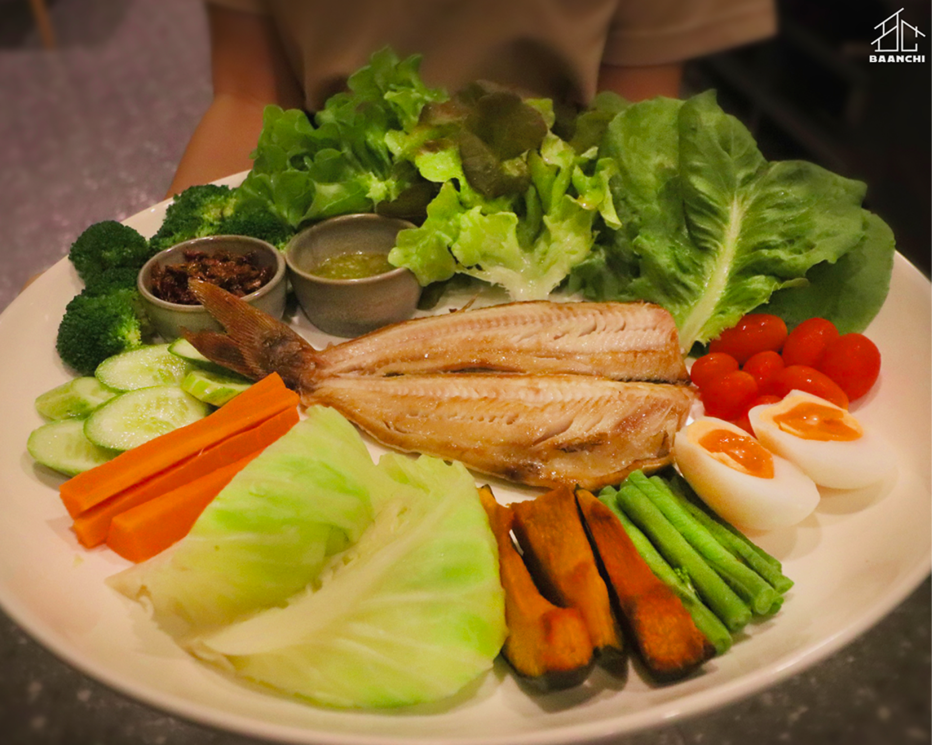 เสิร์ฟคู่กับผักลวก-ผักสดนานาชนิด อาทิ บร็อคโคลี่ ฟักทอง ถั่วฝักยาว แตงกวา กะหล่ำปลี แครอท มะเขือเทศ และไข่ต้มยางมะตูม จัดวางอย่างสวยงามในจานเดียว เพิ่มรสชาติด้วย น้ำพริกกะปิสูตรโบราณ และ น้ำจิ้มซีฟู้ดรสแซ่บ ให้คุณเลือกจิ้มได้ตามสไตล์ที่ชอบ